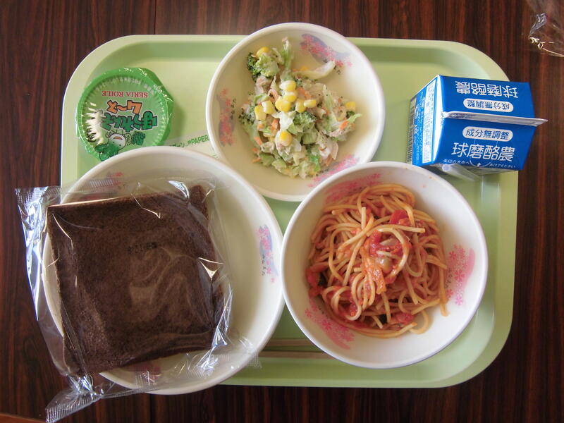 今日のメニューは、どれも子供たちに人気のあるものでした。パインパンは甘くてしっとりしていておいしかったです。ミルメークも、子供たちは嬉しそうに牛乳に混ぜていました。なかなか混ざりませんでしたが、底の方に残ったミルメークも大事に飲んでいました。スパゲッティミートソースも、モリモリ食べていました。