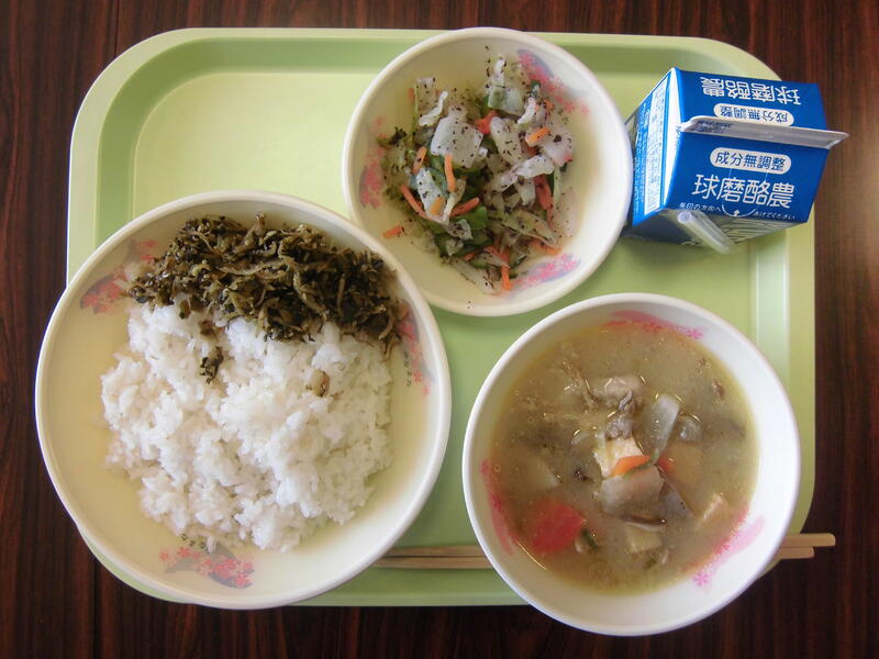 メニュー:麦ごはん、ちりめん高菜、豚汁、ゆかり和え、牛乳