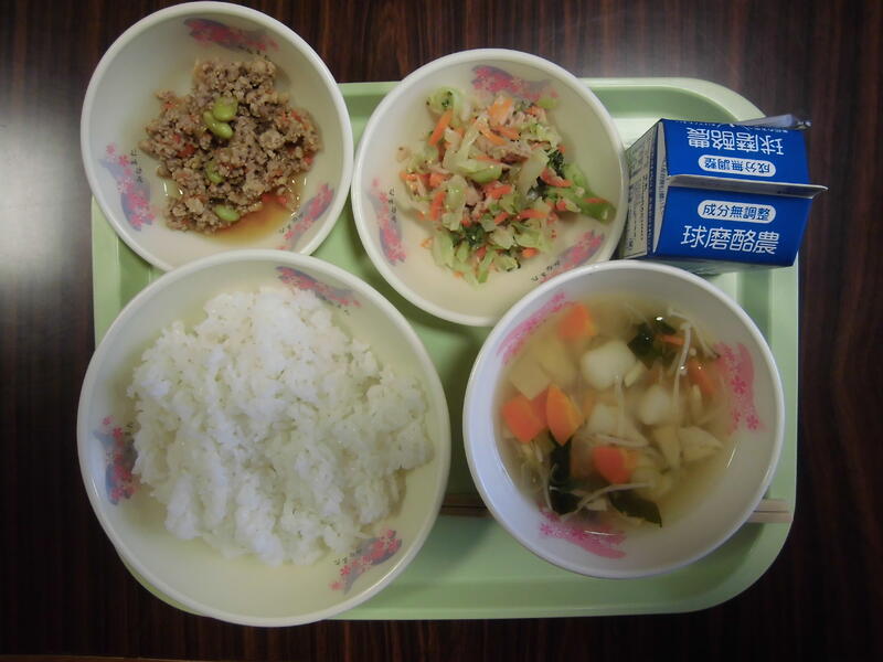 メニュー:ごはん、いわし梅煮、豆乳みそ汁、五目きんぴら、牛乳