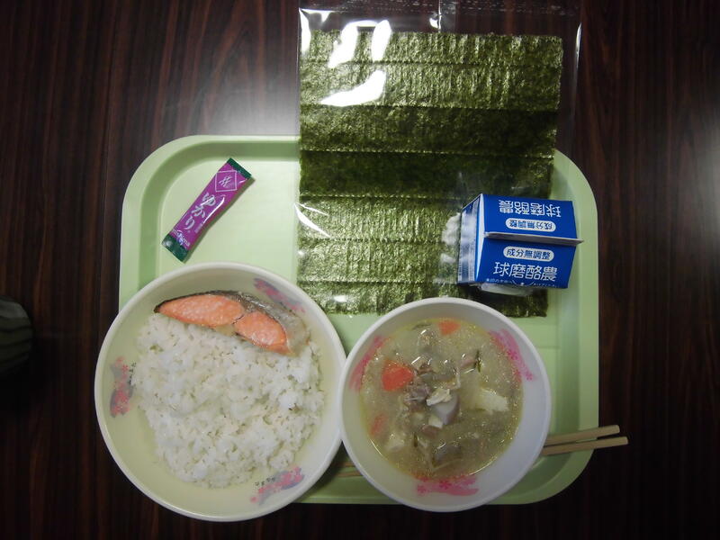 メニュー:セルフおにぎり(麦ごはん、一食焼きのり、一食ゆかり)、焼き鮭、豚汁、牛乳