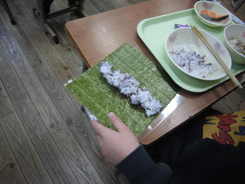 セルフ手巻き、子供たちは大好きな様子でした。のりの香りがとてもよかったです。前回のセルフおにぎりと同様、自分で楽しみながら作っていました。今回も、軍艦巻き風に作っている子供がいました。