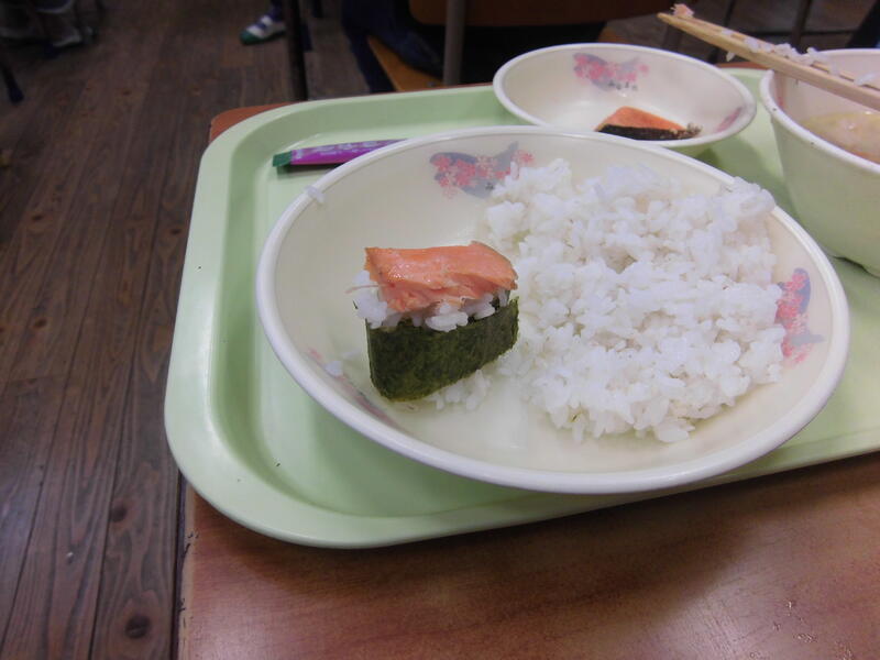 今日は、給食が始まった明治22年当時のメニューにちなんだ給食でした。「セルフおにぎり」ということで、子供たちも、自分の好みに合わせて、工夫を凝らして作っていました。