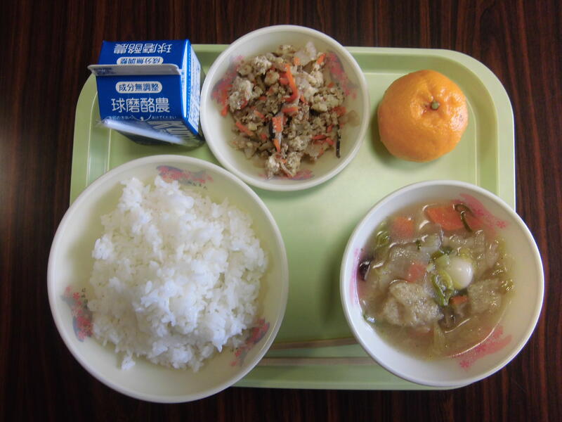 メニュー:びりんめし(ごはん、びりんめしの具)、白玉団子汁、ポンカン、牛乳