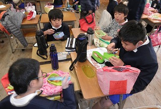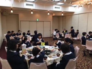 給食を初グループで食べました。少しずつマナーがよくなっています。