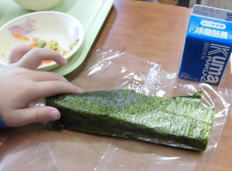 セルフ手巻き、子供たちは大好きな様子でした。のりの香りがとてもよかったです。前回のセルフおにぎりと同様、自分で楽しみながら作っていました。今回も、軍艦巻き風に作っている子供がいました。