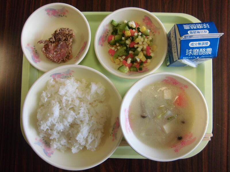 メニュー:ごはん、鶏のから揚げ、わかめスープ、しそ昆布和え、牛乳