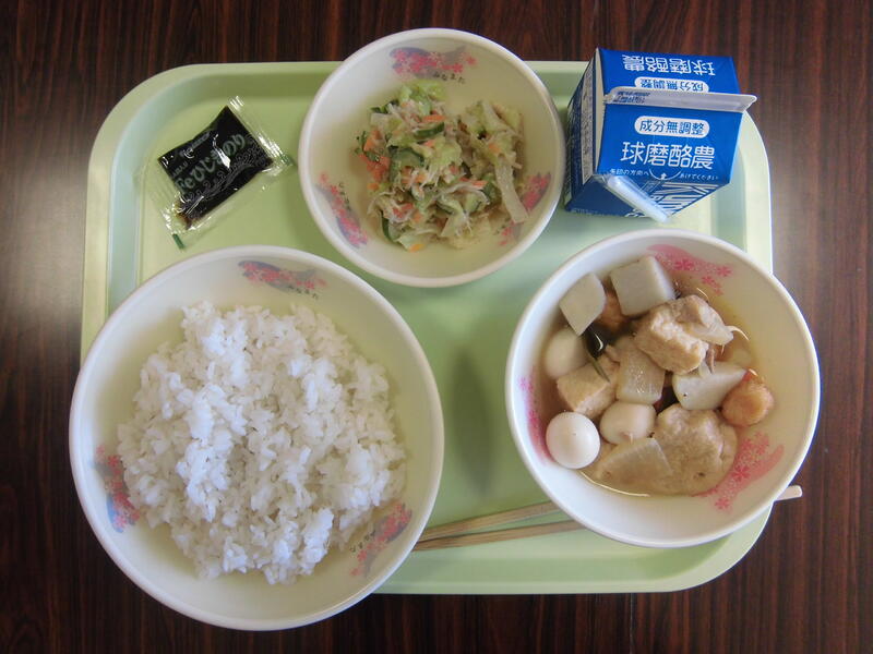 メニュー:麦ごはん、おでん、ごまじゃこサラダ、ひじきの佃煮、牛乳