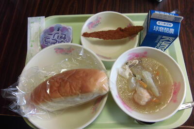 メニュー 黒糖パン、ワンタンスープ、ジューシー、白身魚のチリソース炒め、牛乳