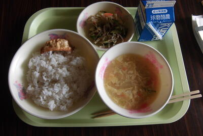 今日のサラダの「マセドアン」は、フランス語で「さいの目切り」や「角切り」を表す言葉です。日本語で言えばコロコロサラダでしょうか?黄粉揚げパンは、児童の好きなメニューの一つ。一個ずつ袋に入っていたので食べやすかったようです。袋に入っていなかった頃は、お盆の上が黄粉だらけになっていましたね。