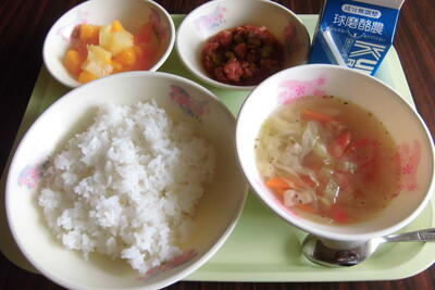 メニュー チキンライス、野菜スープ、フルーツゼリー、牛乳