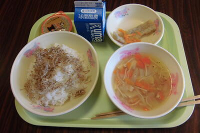 メニュー 梅じゃこごはん、サラ玉とたけのこのスープ、太刀魚の甘夏南蛮漬け、みかんゼリー、牛乳