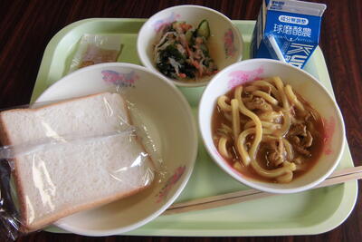 メニュー 食パン、カレーうどん、わかめとツナのサラダ、りんごジャム、牛乳