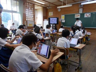 9月7日(火)水俣市教育委員会のALTのリン先生と3年生は、一緒に国語の「へんとつくり」の勉強をしました。授業の初めにリン先生の自己紹介をしていただきましたが、リン先生が故郷の写真を見せられると「とてもきれい」「行ってみたい」と感動していました。