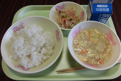 メニュー 麦ごはん、スーミータン、揚げギョウザ、中華サラダ、牛乳