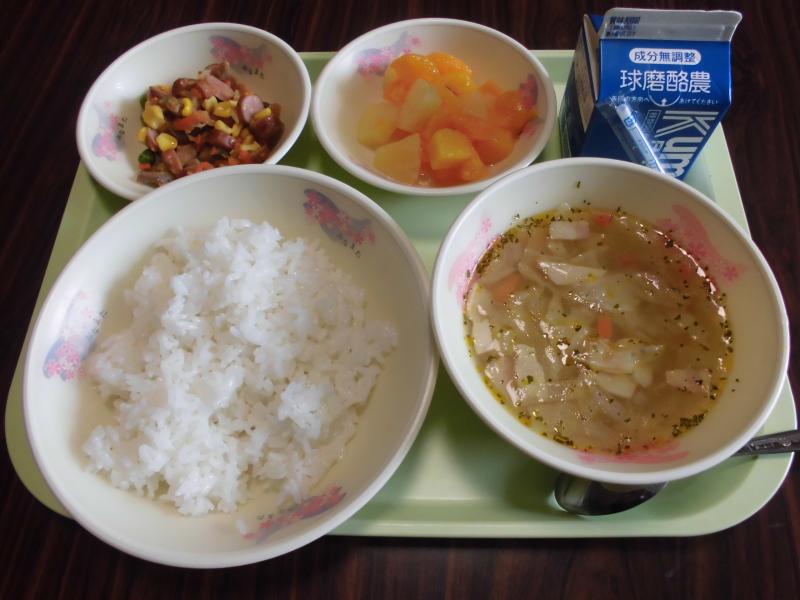 メニュー ピラフ、野菜スープ、フルーツのゼリー和え、牛乳