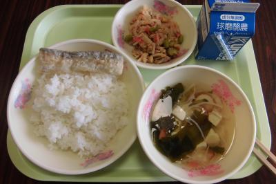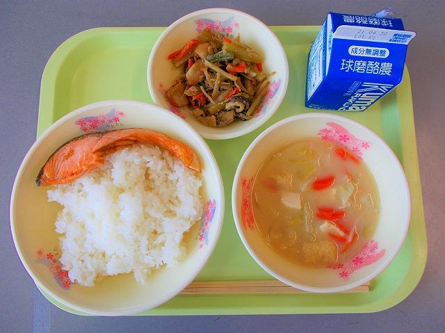 メニュー:ごはん、春野菜の豆乳、みそ汁、つわんこ炒め、鮭の塩焼き、牛乳