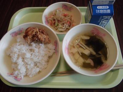 メニュー もち麦ごはん、若竹汁、ごま酢あえ、鶏のから揚げ、牛乳