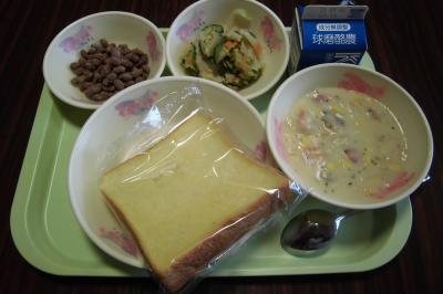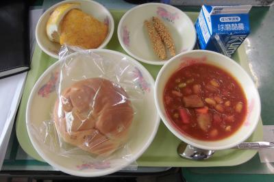 今日の給食は、洋食ですね。給食のパンは、昔はコッペパンか食パンでしたが、いろいろな種類のパンが出されるので楽しみがありますよね。小麦粉パンより米粉パンの方が好きだという児童も多いようです。大豆は、植物性たんぱく質が豊富で、体をつくるもとになります。チョコタフィーは、子どもたちが喜んでおいしく大豆を食べられるようにと工夫されたものです。しっかり噛むことによって虫歯予防にもつながります。