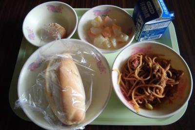 メニュー ソフトフランスパン、スパゲッティミートソース、フルーツヨーグルト、チキンナゲット、牛乳