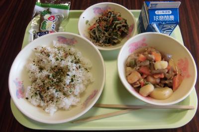 メニュー 麦ごはん、新じゃがいものうま煮、のり酢和え、ふりかけ、かしわもち、牛乳