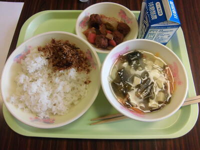 メニュー:麦ごはん、わかめスープ、肉団子の甘酢和え、手作りふりかけ、牛乳
