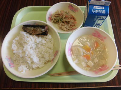 メニュー:もち麦ごはん、春野菜の豆乳みそ汁、いわし梅煮、菜の花のごま和え、牛乳