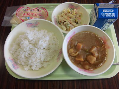 今日は、小学6年生の卒業祝いのメニューになっています。カレーは、鶏肉とミートボールがたっぷり入ったお肉ごろごろカレーです。ボリュームがあり元気が出ると思います。6年生の皆さん卒業おめでとうございます。
