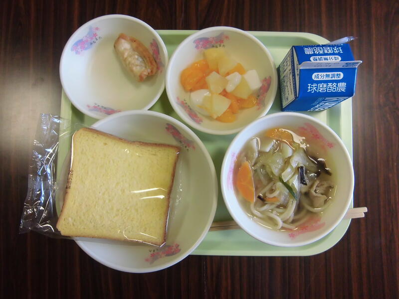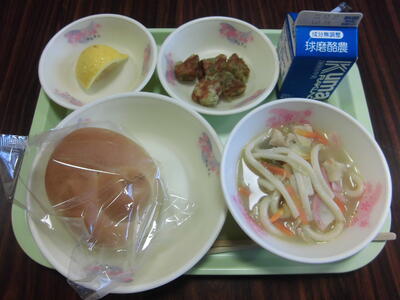 メニュー:ひのくにパン、かしわうどん、ちくわの磯辺揚げ、はるか、牛乳