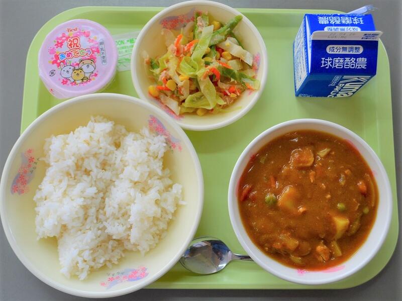 メニュー:麦ごはん、チキンカレー、アスパラサラダ、牛乳、お祝いデザート