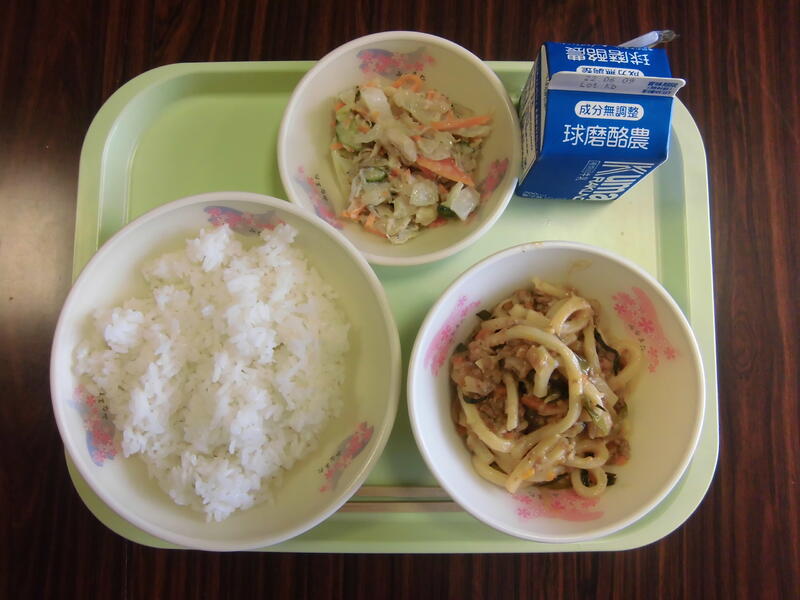 メニュー:ごはん、ジャージャーうどん、ごまじゃこサラダ、牛乳