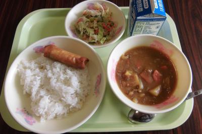 メニュー 麦ごはん、サラ玉たっぷりカレー、春巻き、じゃこサラダ、牛乳