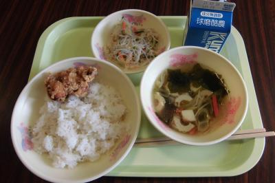 メニュー 麦ごはん、わかめスープ、鶏のから揚げ、バンサンスー、牛乳