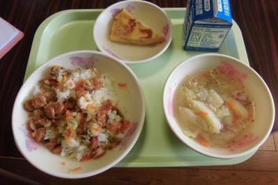 メニュー カレーピラフ、野菜とベーコンのスープ、スパニッシュオムレツ、牛乳