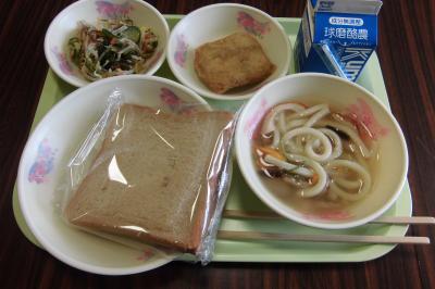 メニュー 黒糖パン、肉しのだうどん、海藻サラダ、牛乳