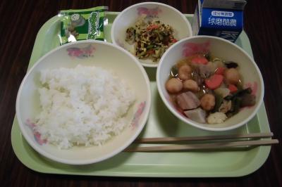 メニュー ごはん、筑前煮、かつのり和え、一食まっ茶大豆、牛乳