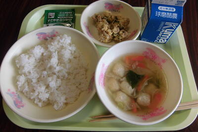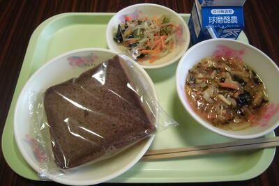 メニュー 黒糖パン、ワンタンスープ、ジューシー、白身魚のチリソース炒め、牛乳