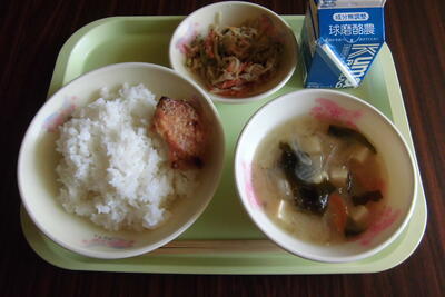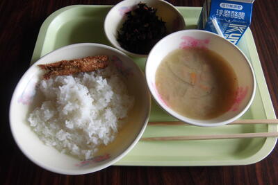 メニュー ごはん、といものみそ汁、切干大根の酢の物、魚の西京焼き、牛乳