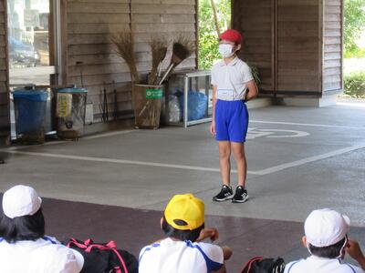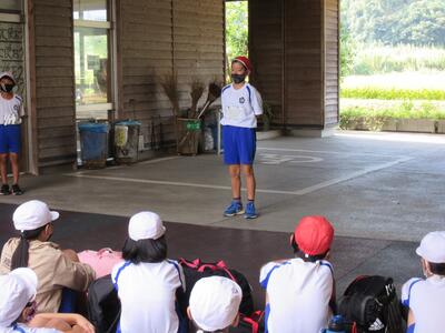 今日から5年生は、1泊2日の集団宿泊教室です。下の写真は、出発式の様子です。この2日間に頑張りたいことを代表児童が発表して2日間の日程がスタートしました。