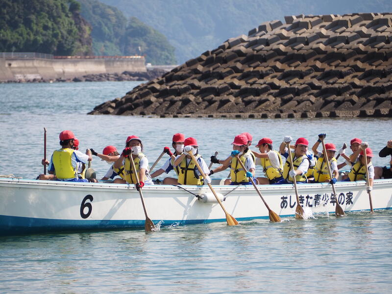 今日は、天候にも恵まれ、予定どおりマリン活動(ペーロン船乗船)を行うこともできました。一船14人で漕いだということで「きつかった」と言っている子もいましたが楽しめたようです。