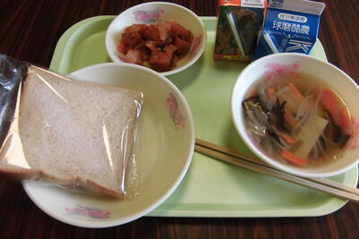 今日のおかずは、中華風です。味付けは、子供向けで辛みは抑えてありますが、主食のココアパンにもよく合っておいしかったです。味は、個人の好みが大きく影響しますが、給食メニューの味付けはみんなの口に合うようにいつも工夫され、すごいですね。