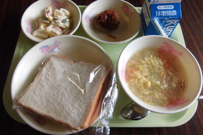今日はサンドウィッチ用の食パンが2枚でした。そうなるとハンバーグを挟むか、サラダを挟むか、はたまた両方を挟むか?私自身は、サラダをサンドしたのですが、何人かの児童に聞いたらハンバーグ派が多かったようです。どちらにしてもおいしくいただきました。