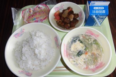 メニュー 麦ごはん、中華卵スープ、酢豚、お祝いデザート、牛乳