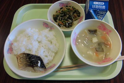 メニュー ごはん、鯖の塩焼き、豆腐とわかめの味噌汁、ごま和え、牛乳