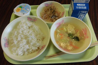 メニュー 麦ごはん、中華卵スープ、チャプチェ、パインゼリー、牛乳