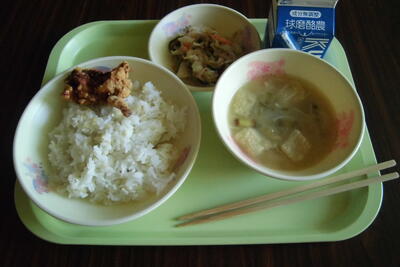 メニュー もち麦ごはん、夏野菜のみそ汁、鶏のから揚げ、梅おかか和え、牛乳