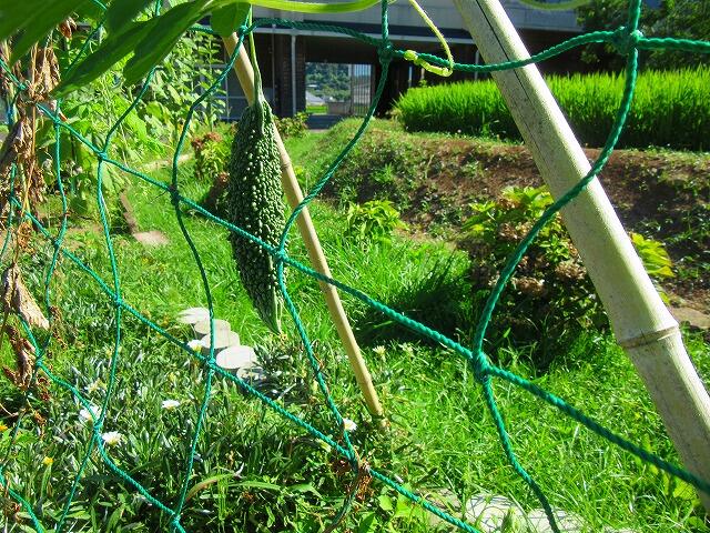 校門側に植えたツルレイシは1本だけですが、炎天下の中、暑さに負けず成長を続けています。