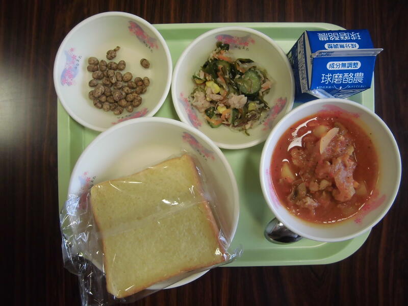 メニュー:米粉入りかぼちゃパン、チキンのトマト煮、海藻サラダ、黒糖ビーンズ、牛乳
