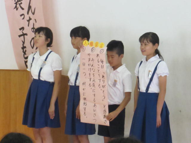 26日(水)の児童集会で、各クラスが人権宣言を発表