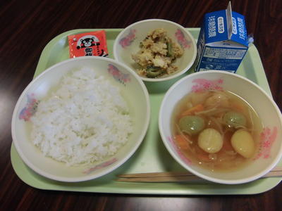 秋の味覚の代表の栗とさつまいもを使った炊き込みご飯です。はんぺん汁は、なじみがない児童も多いかと思いますがおいしかったです。関東では、おでんによく使われる具材ですね。