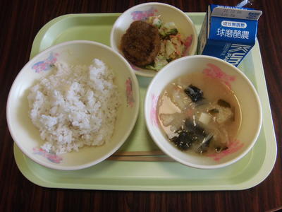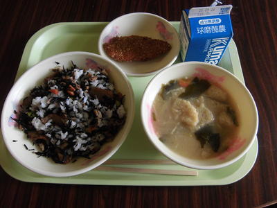 メニュー ひじきごはん、里芋の味噌汁、魚のごま揚げ、牛乳